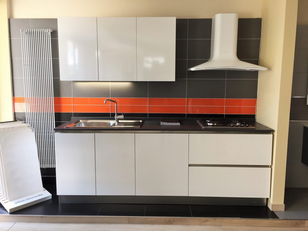 CUCINA: Aurora modello Jolie. Ante in laminato finitura bianco lucido con maniglia a gola, cassetti ed ante dotate di chiusura ammortizzata. Top in quarzo. PAVIMENTO E RIVESTIMENTO: Vogue serie Shade.